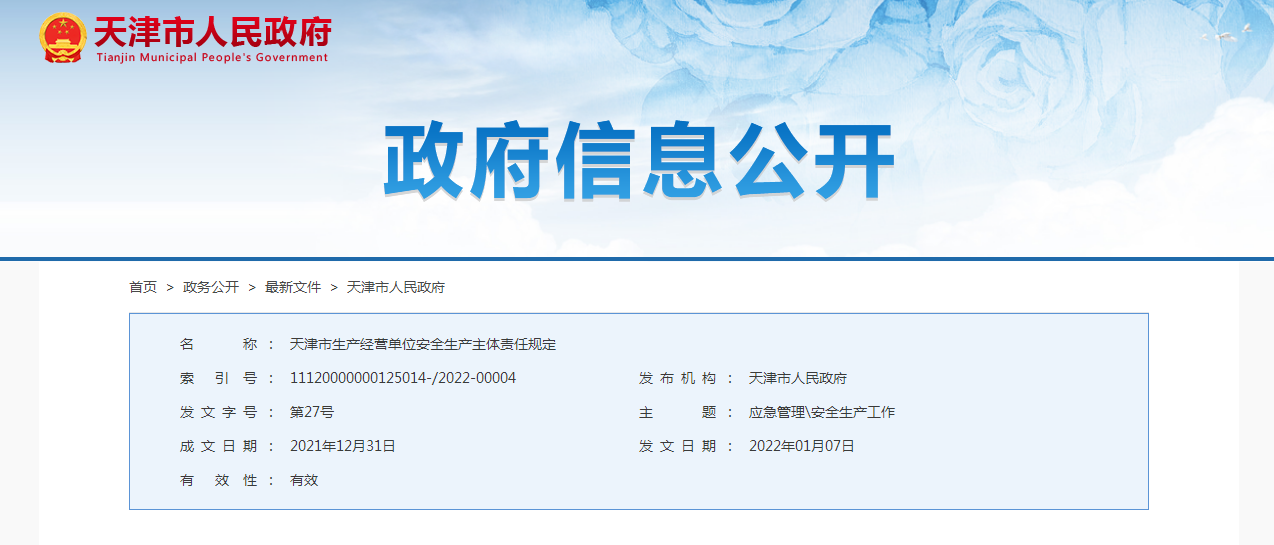 2021年12月24日,天津市人民政府第175次常务会议通过了《天津市生产经营单位安全生产主体责任规定》自2022年3月1日起施行。生产经营单位是落实安全生产的责任主体。切实抓好生产经营单位的安全生产工作,是预防和减少生产安全事故的基础和关键,是贯彻落实以人为本、安全发展理念的具体体现。